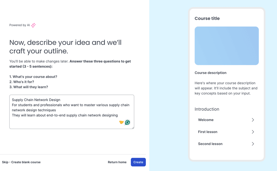When beginning a new course creation process, you can choose to start entirely fresh or leverage Thinkific’s AI-powered outline generator to automatically propose a course structure based on the topic you provide.