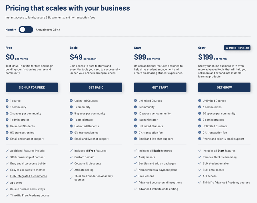 • The Grow subscription ($199/month) delivers sophisticated capabilities (such as developer interface access and eliminating Thinkific brand elements) perfectly suited for expanding educational businesses.