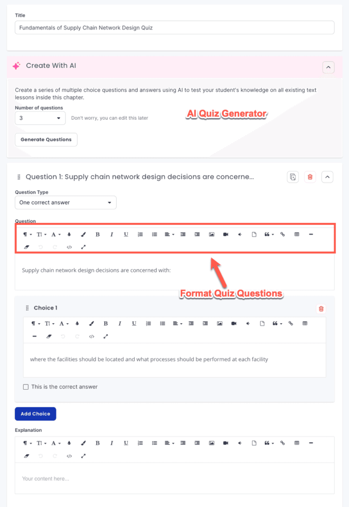 Regarding the available formats for questions, the platform supports both multiple-choice and multiple-selection styles. Additionally, Thinkific incorporates a versatile text editor for composing both questions and answers, empowering you to insert text, images, and videos, and apply formatting according to your preferences.