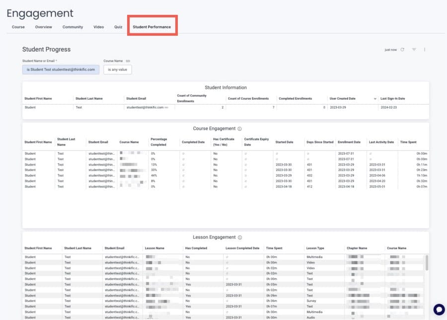 Thinkific’s student performance report