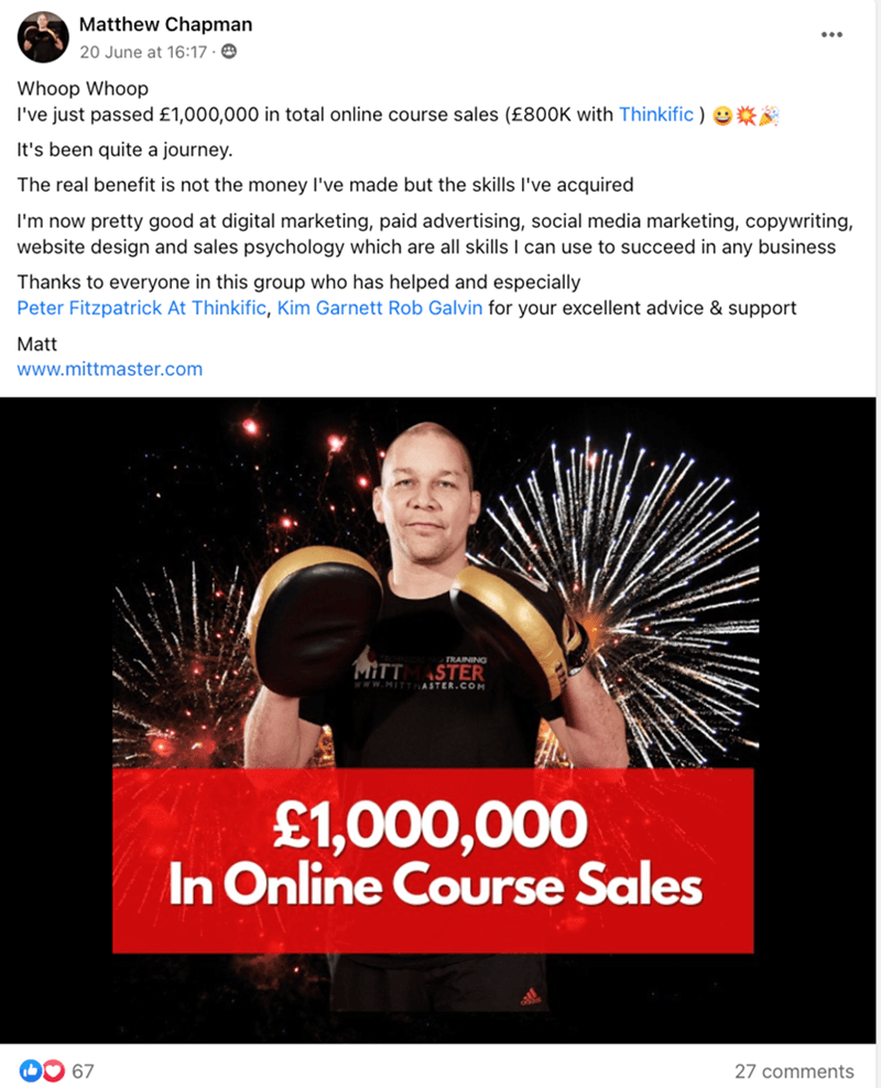 In addition to course materials, it offers privileged entry into a community environment created via Thinkific.