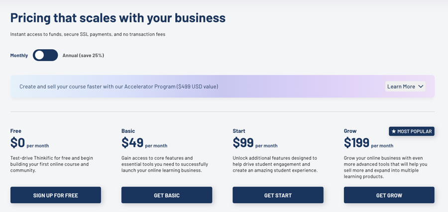 Furthermore, if you require API accessibility or the option to eliminate Thinkific’s branding, you will need to subscribe to the Grow plan (at $199 per month).