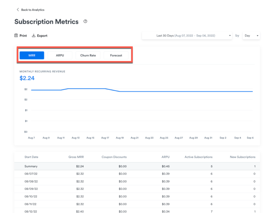 • Key figures for subscriptions, like monthly recurring revenue and customer attrition.