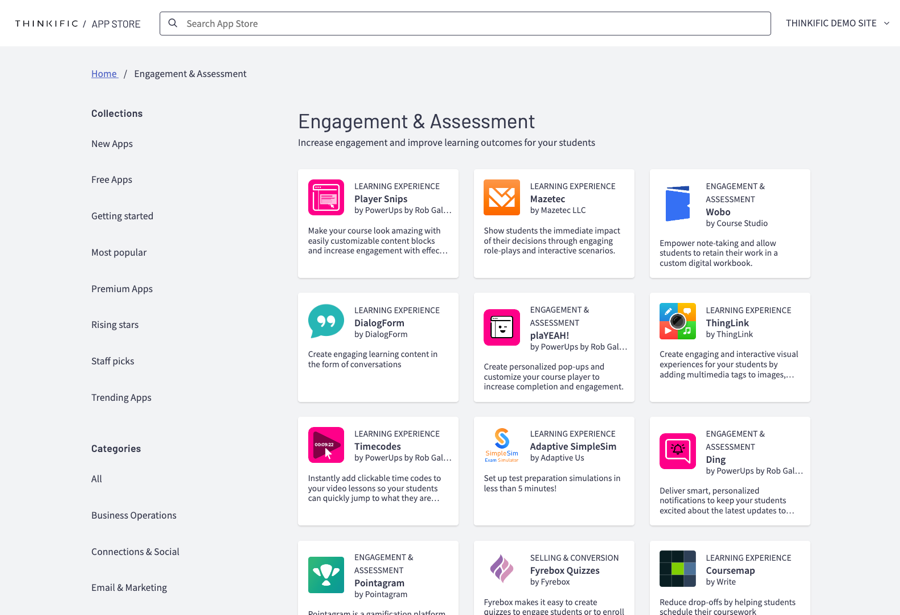 Conversely, Thinkific features a complete application marketplace where over one hundred apps and integrations can be discovered.