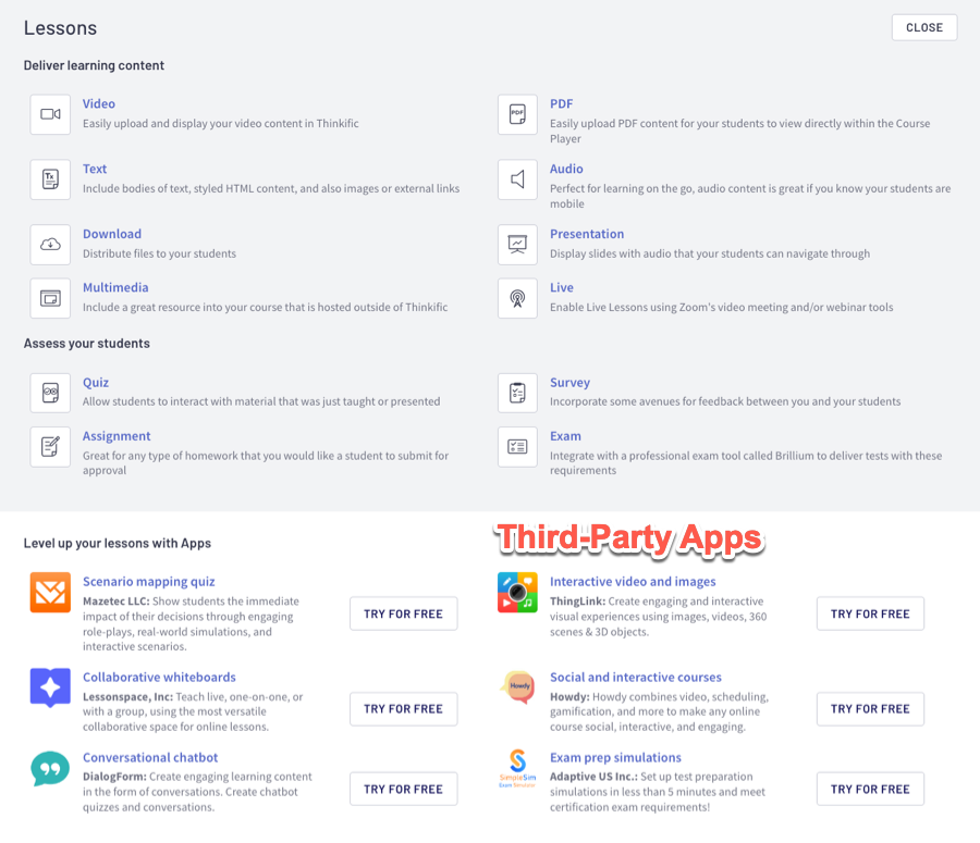 Nevertheless, Thinkific’s integration with third-party applications allows you to incorporate more sophisticated types of lessons into your educational programs.