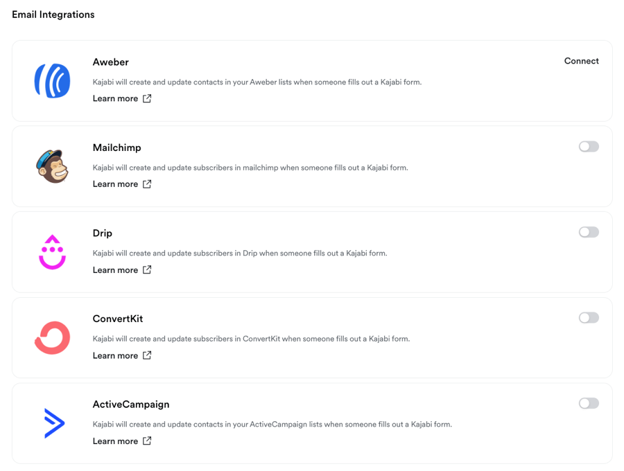 Using Kajabi, you receive direct, built-in integrations with widely-used email marketing systems such as ConvertKit, ActiveCampaign, Drip, and several others.