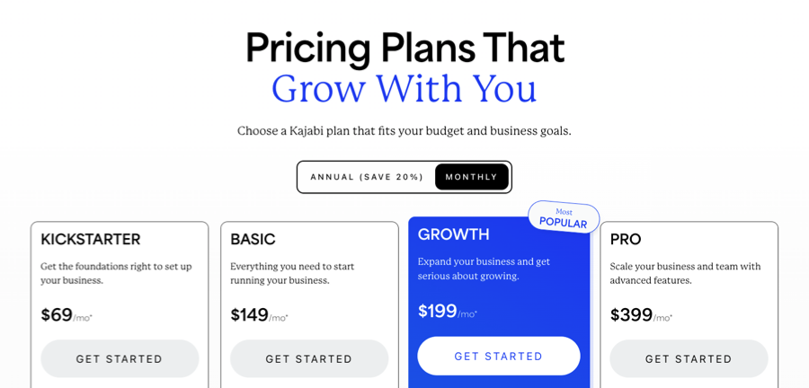 Kajabi offers four distinct subscription tiers, with costs ranging from $69 per month to $399 per month. Although no transaction charges are applied to any tier, they do impose restrictions on the quantity of active clients and permissible products for each subscription level.