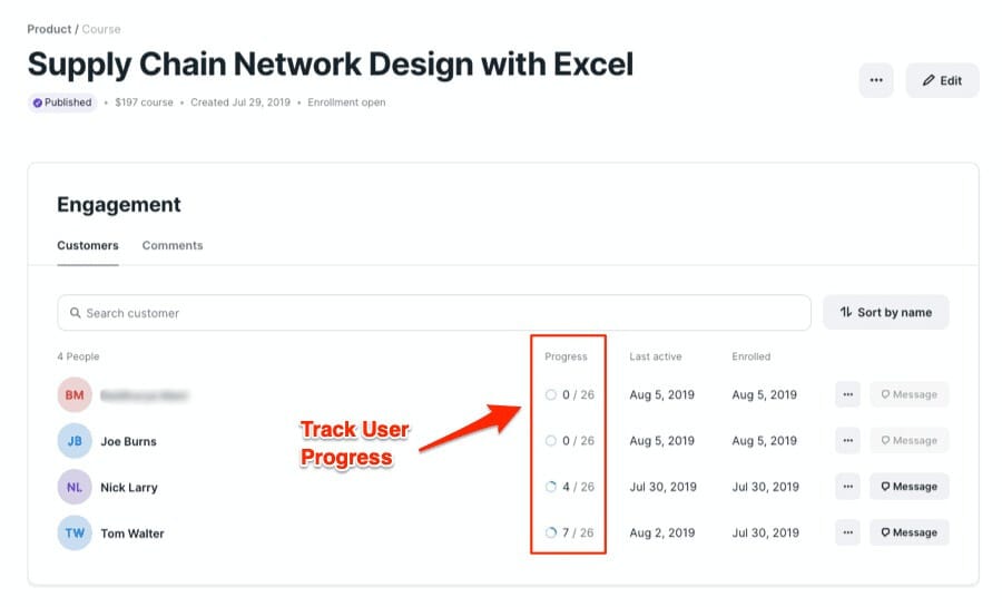 When it comes to course reporting capabilities, Kajabi offers a Product Progress report that allows you to monitor the progress of individual students as they navigate through your course content.