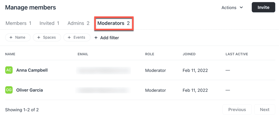 Moderators, conversely, are designated to particular spaces and groups. Their responsibilities encompass managing the settings for these specific spaces or groups, adding or removing members as necessary, deleting posts and comments, and similar tasks.