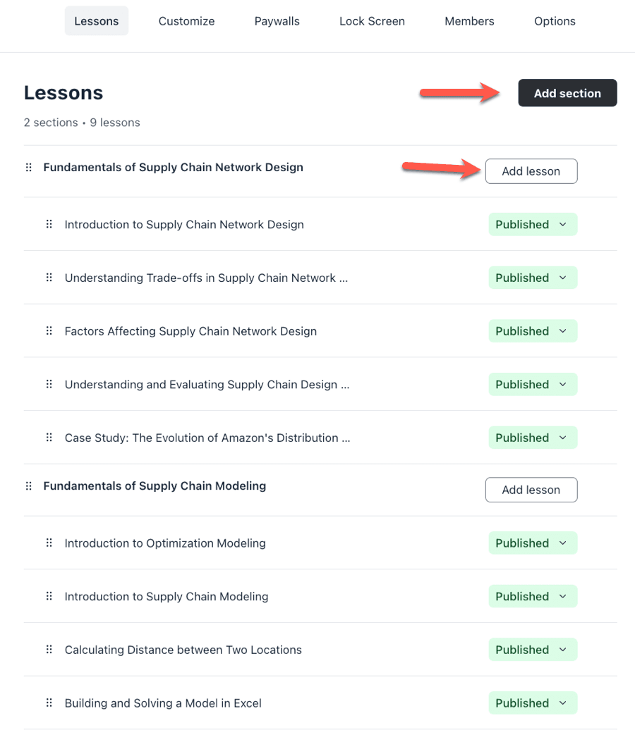 Developing a course within Circle.so is a straightforward endeavor thanks to its intuitive drag-and-drop construction interface. You can utilize this tool to incorporate various sections and individual lessons, and then easily rearrange their sequence according to your preferences.