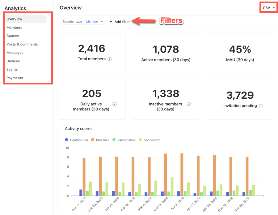 The Analytics interface is segmented into various distinct areas, which include Overview, Members, Posts & Comments, Messages, and Spaces.
