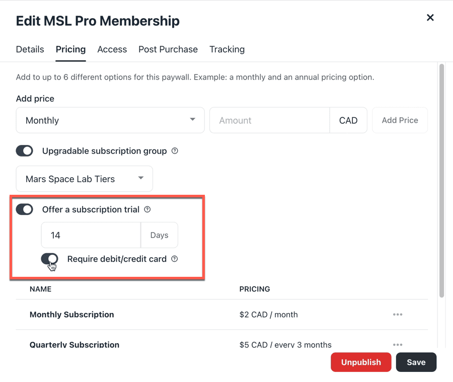 Pricing options in Circle’s Paywalls