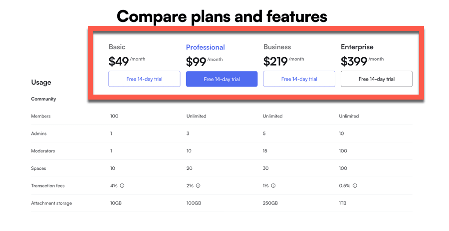 Circle has a tiered pricing plan, ranging from $49 to $399 per month. On top of the monthly cost, you need to pay a transaction fee, starting from 4% per transaction. It also offers a 14-day free trial.