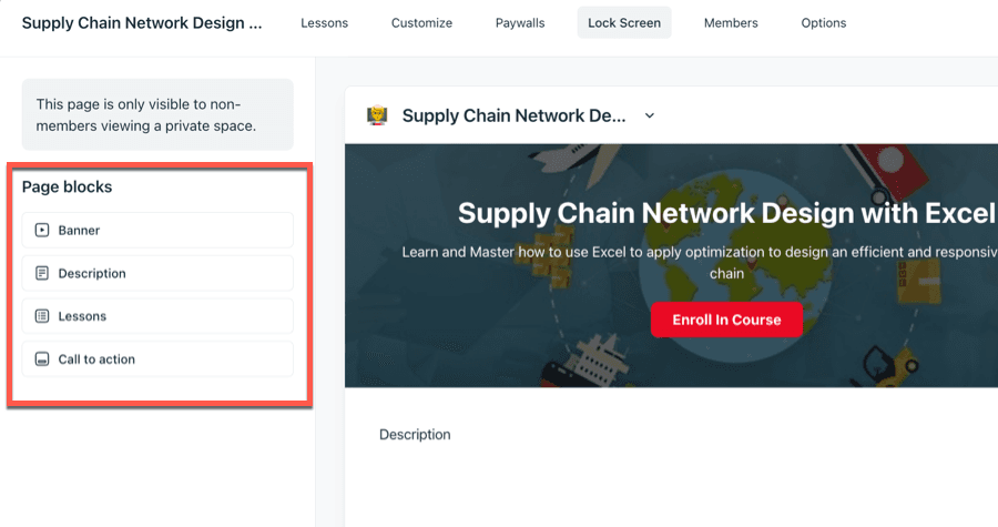The page construction tool is exceptionally basic and accommodates only four distinct page segments. You have the option to display a Banner segment, a description of the Space, a list of course lessons, and a call-to-action (CTA) segment.