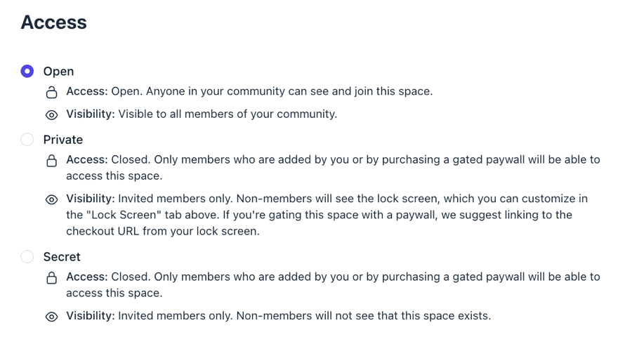 Concerning privacy configurations and access controls, you have the flexibility to maintain your Space as open, private, or entirely secret. Furthermore, you can position it behind a payment barrier and even display a bespoke introductory page to individuals who are not yet members.