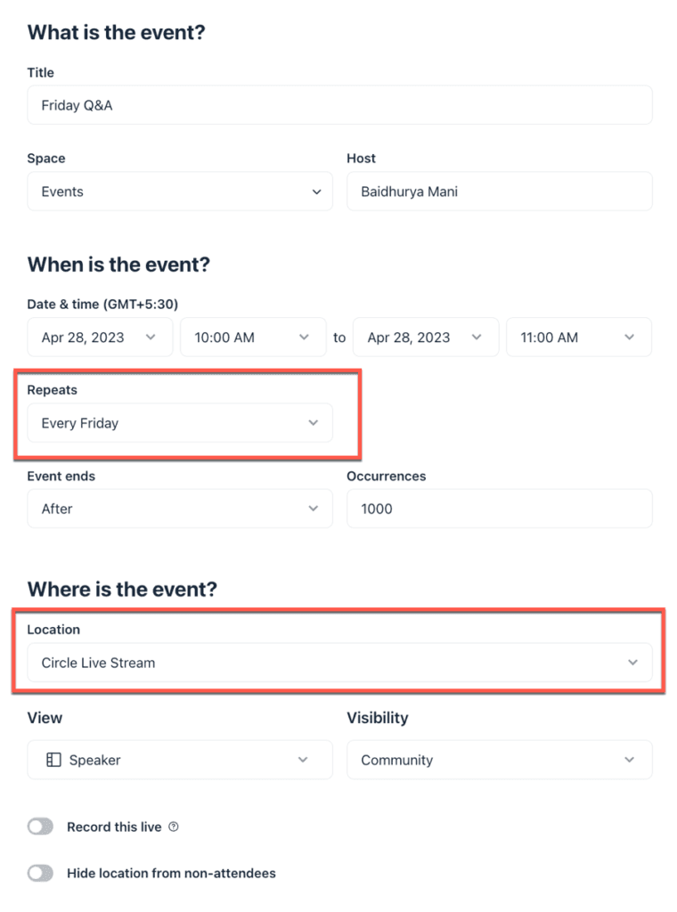 Establishing an event within Circle.so is a swift and uncomplicated process—you just need to input fundamental details, such as the specific date and time, whether it is a singular or repeating occasion, and its venue, and then you are all set.