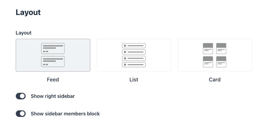 Circle.so further presents several visual arrangement choices specifically for the Posts area. You are able to select from feed-style, list-based, or card-oriented presentations and additionally refine the visual presentation using features such as displaying a supplementary sidebar.