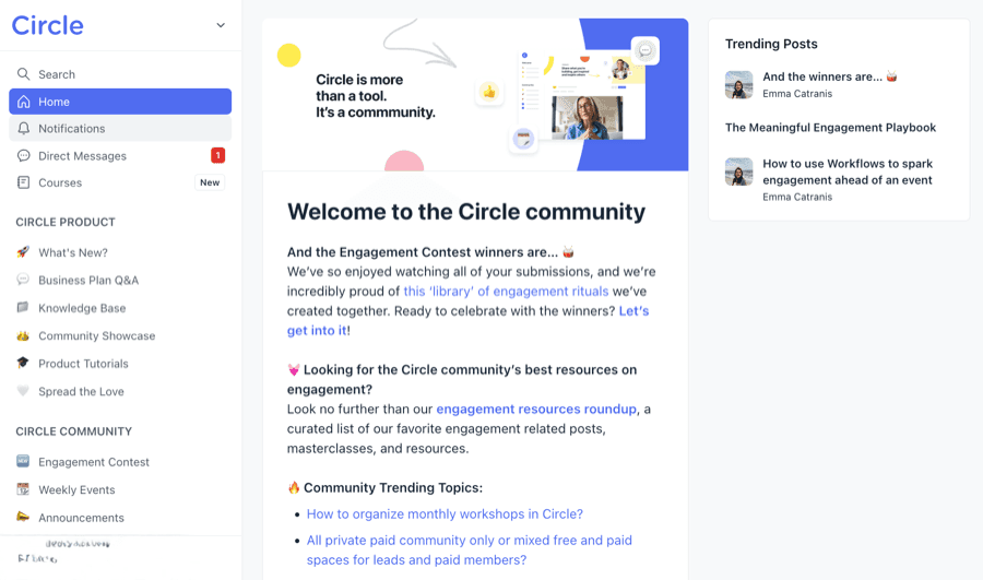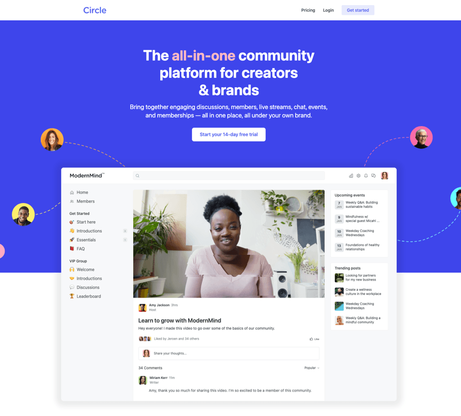 Circle is an online community platform used by creators and business owners to build and engage their communities. It has a wide range of features and tools to help you create spaces, host events, and offer online courses.