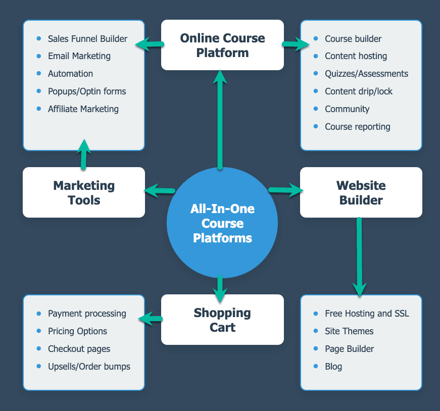 • Sales Features: Critical capabilities like promotional pages and transaction processing for selling online courses