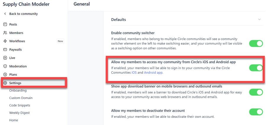 To achieve this, please navigate to Settings → Defaults in your administrative dashboard, and confirm that the toggle for “Allow my members to access my community from Circle’s iOS and Android app” is set to the on position.