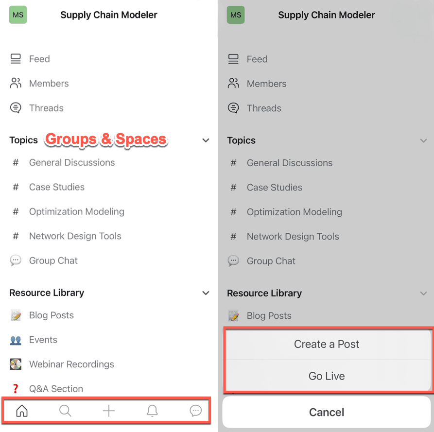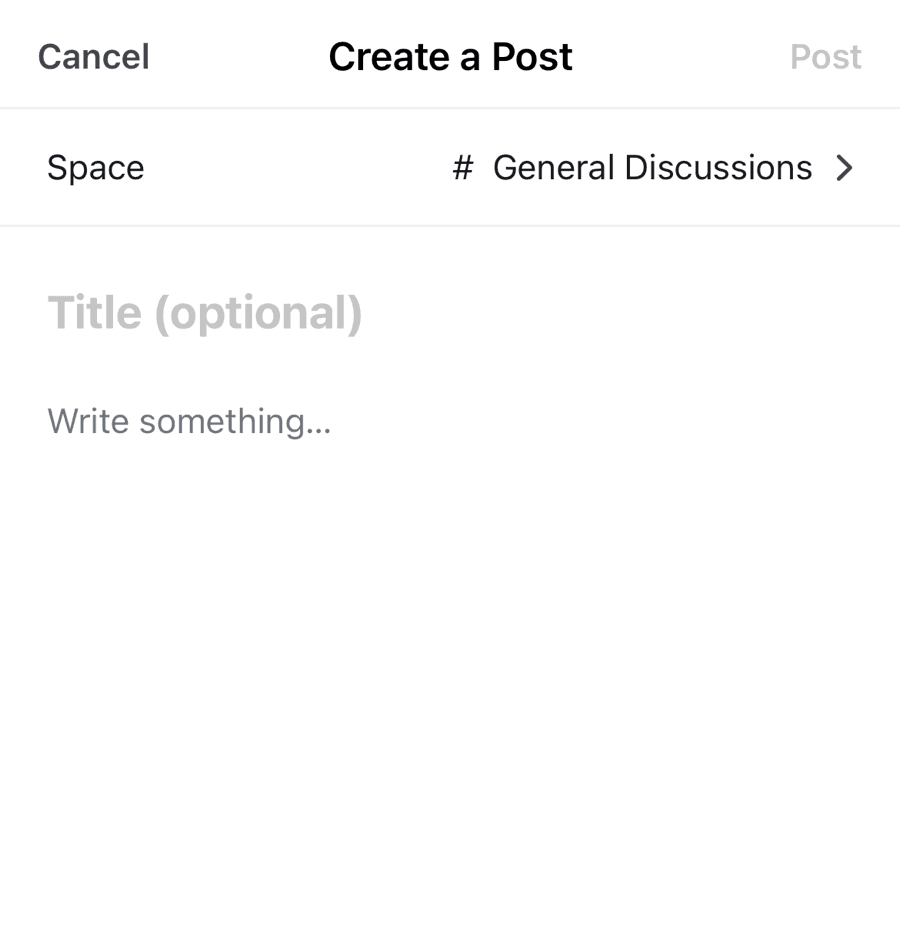 Members can delve into discussions within a particular space simply by tapping on it. To initiate a new discussion thread, they should tap the Plus icon located in the lower section of the screen and then select the “Create a Post” option.