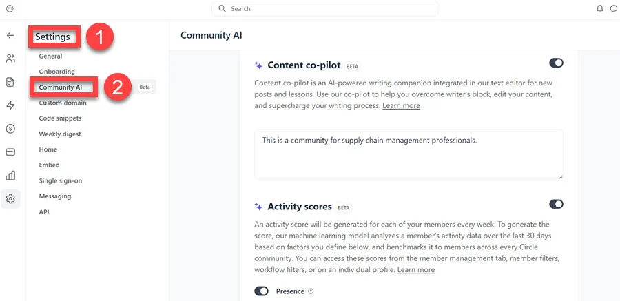 Community AI encompasses all the platform’s artificial intelligence-driven solutions designed to assist Circle creators in managing various elements of their community ecosystems. These innovative AI tools minimize manual effort by introducing powerful capabilities for streamlined community administration: