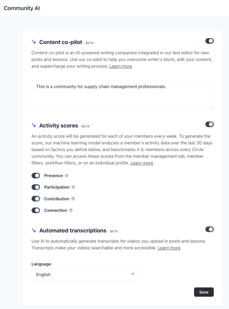While the co-pilot feature accelerates your ability to produce compelling community content, automated transcription capabilities enhance video searchability and indexability while elevating the overall user experience. Simultaneously, activity scoring systems provide deeper insights into your membership’s engagement patterns.