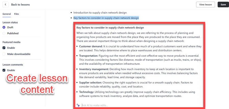 To utilize this feature within your course environment, either create a new lesson or access an existing one, which immediately grants you entry to the writing assistant directly through the lesson editor interface.