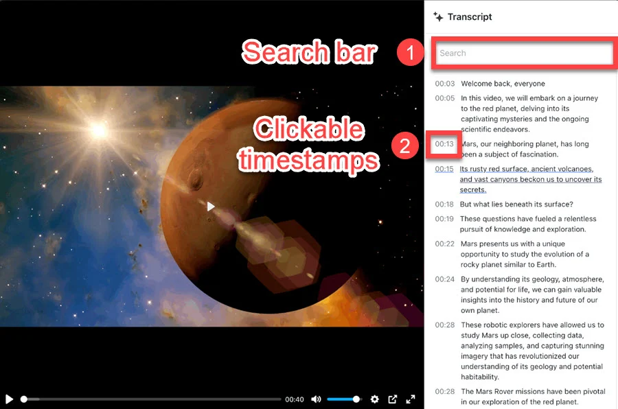 This functionality also enables community participants to locate specific video segments with precision. Rather than engaging in a frustrating search process, members can simply enter relevant phrases into the transcription search function and navigate directly to their desired content sections.