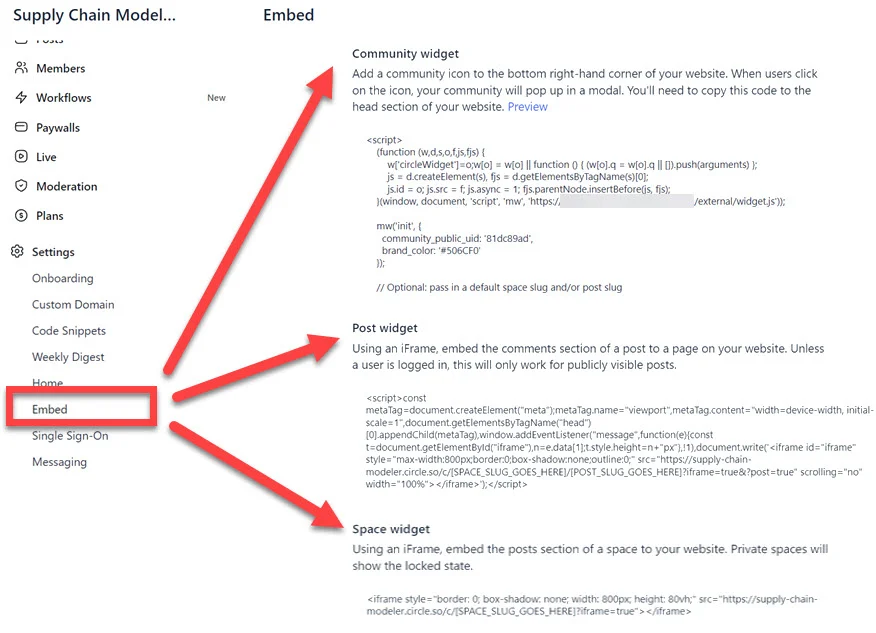 Another way to integrate Circle with other platforms is to use its iFrame widgets.With these widgets, you can show your community or a part of it on any website.So, if you already have a website or blog, you can easily embed your entire community, a space, or a post into it. That way, your members can see what’s happening in your community without leaving your website or blog.
