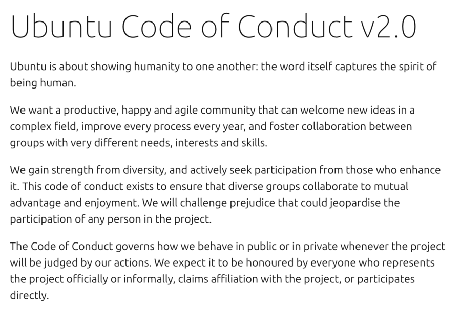 Ubuntu, a prominent software development organization, has cultivated diverse communities surrounding its various product offerings. Their code of conduct is extensive and addresses numerous straightforward scenarios, but immediately establishes clear expectations from the outset.
