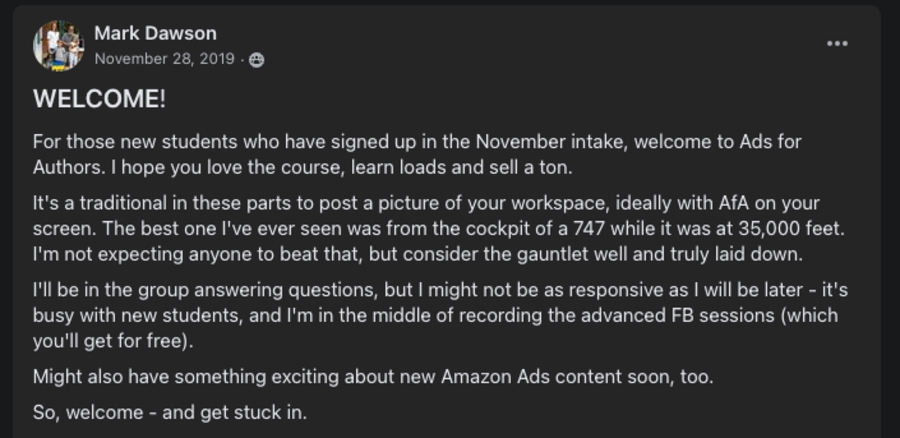 When you become part of the Self Publishing Formula’s Ads for Authors program, for example, you gain access to their SPF-Mastery curriculum. Upon entering this space, participants are invited not only to share personal information but also to contribute images of their working environment. This creates an engaging opportunity to showcase your setup (ideally impressive) while simultaneously glimpsing the workspaces of fellow community members.
