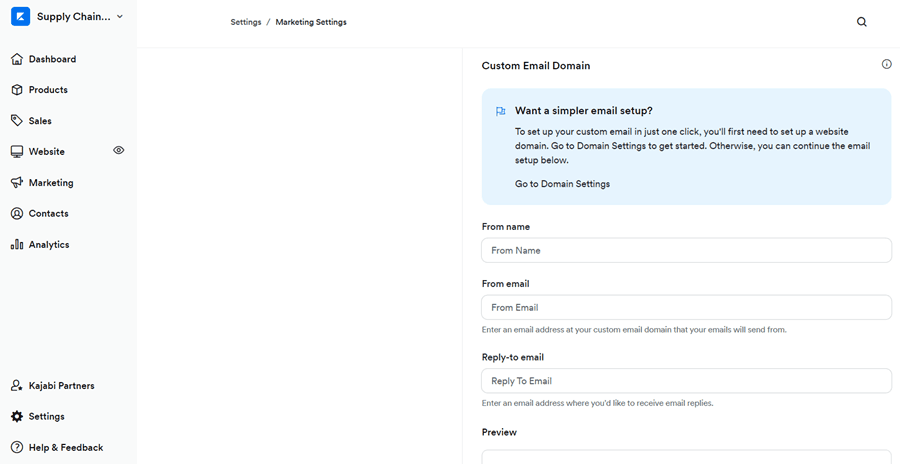 As previously indicated, you can configure marketing communications to originate from your organization’s domain. To implement a custom email domain, your Kajabi website must first be operating on a custom domain setup.