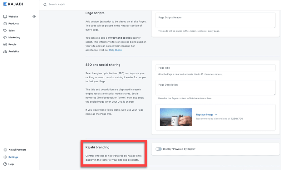 To eliminate Kajabi’s embedded branding elements, you’ll need to subscribe to the Growth tier ($199/month) or a higher-level subscription.