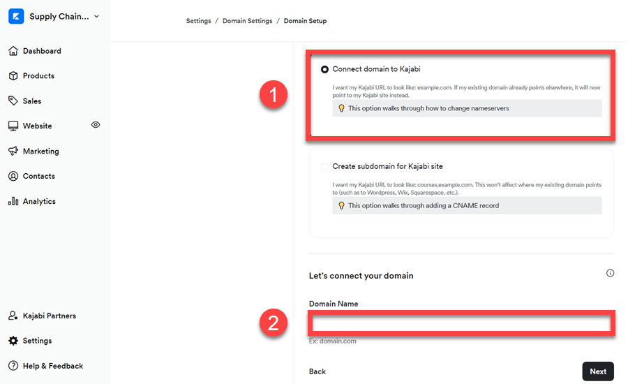 If your intention is to connect your primary web address to the Kajabi platform, utilize the first available option. Alternatively, if you maintain an existing website on another service, you have the flexibility to implement a subdomain instead.