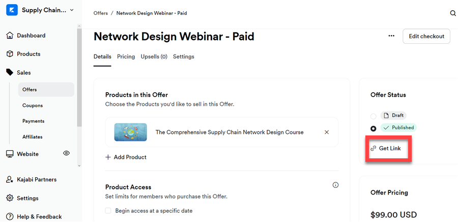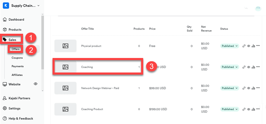 Initially, navigate to your Kajabi administrative control panel and proceed to Sales → Offers, then select the particular product package you wish to reference.