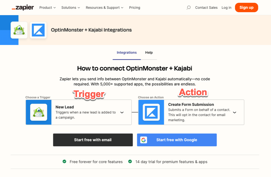 In this scenario, configure the initiating event as New Lead within OptinMonster, paired with the resulting operation Create Form Submission in Kajabi. Note that the specific triggering event will vary based on your chosen lead capture application.