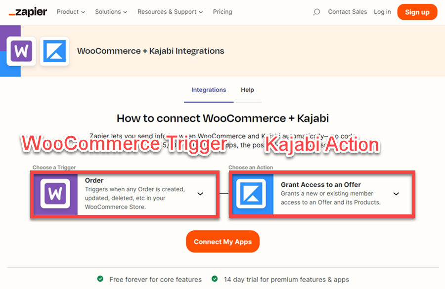 To implement this configuration, you’ll need to establish an automated process through Zapier. Configure the initiating event as Order within the WooCommerce system, paired with the resulting operation Grant Access to an Offer within Kajabi.