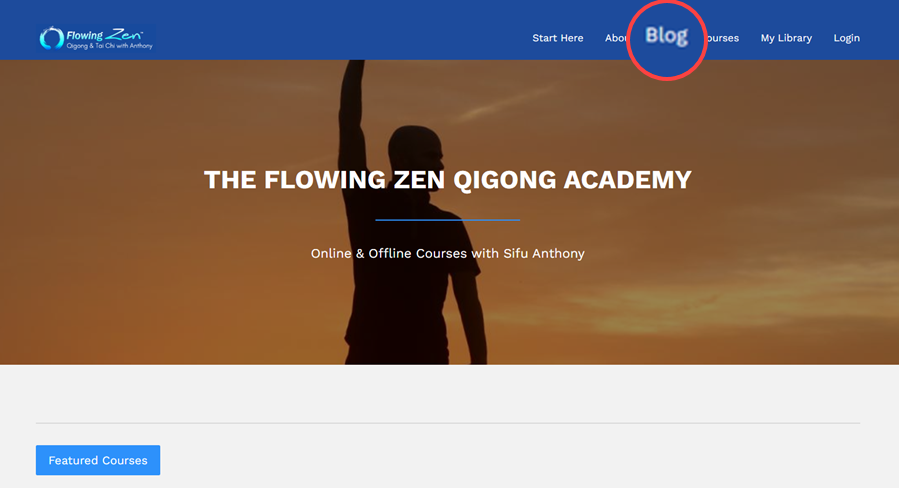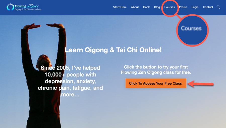 Flowing Zen incorporates a dedicated navigation element—Courses—within their primary menu structure that seamlessly directs visitors to their Kajabi learning environment. Additionally, they feature direct pathways to specific educational offering pages directly from their welcome screen.