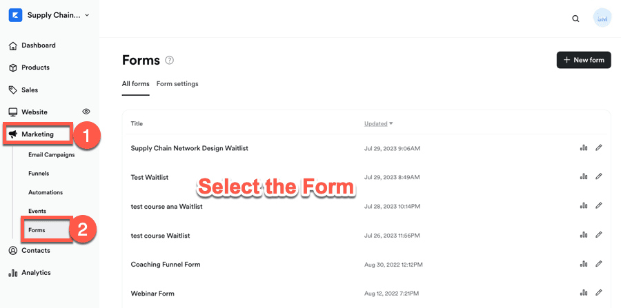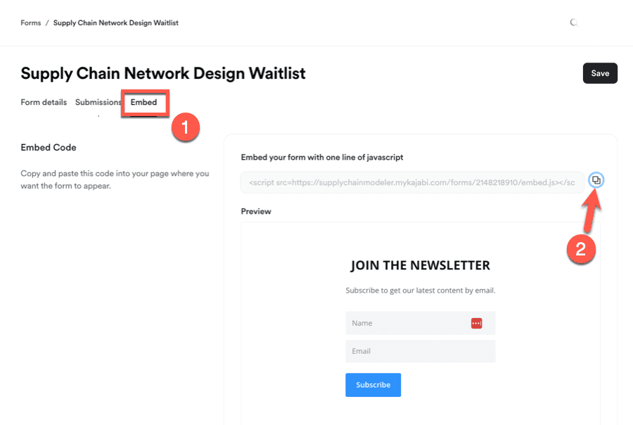 To implement this approach, access Marketing → Forms, and identify your desired subscription form. Then proceed to the Embed section and extract the provided JavaScript implementation code.