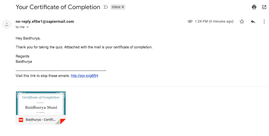 As demonstrated in the screenshot below, you will observe that Zapier has successfully generated a custom certificate for your student, which confirms that our automated workflow is operating correctly.