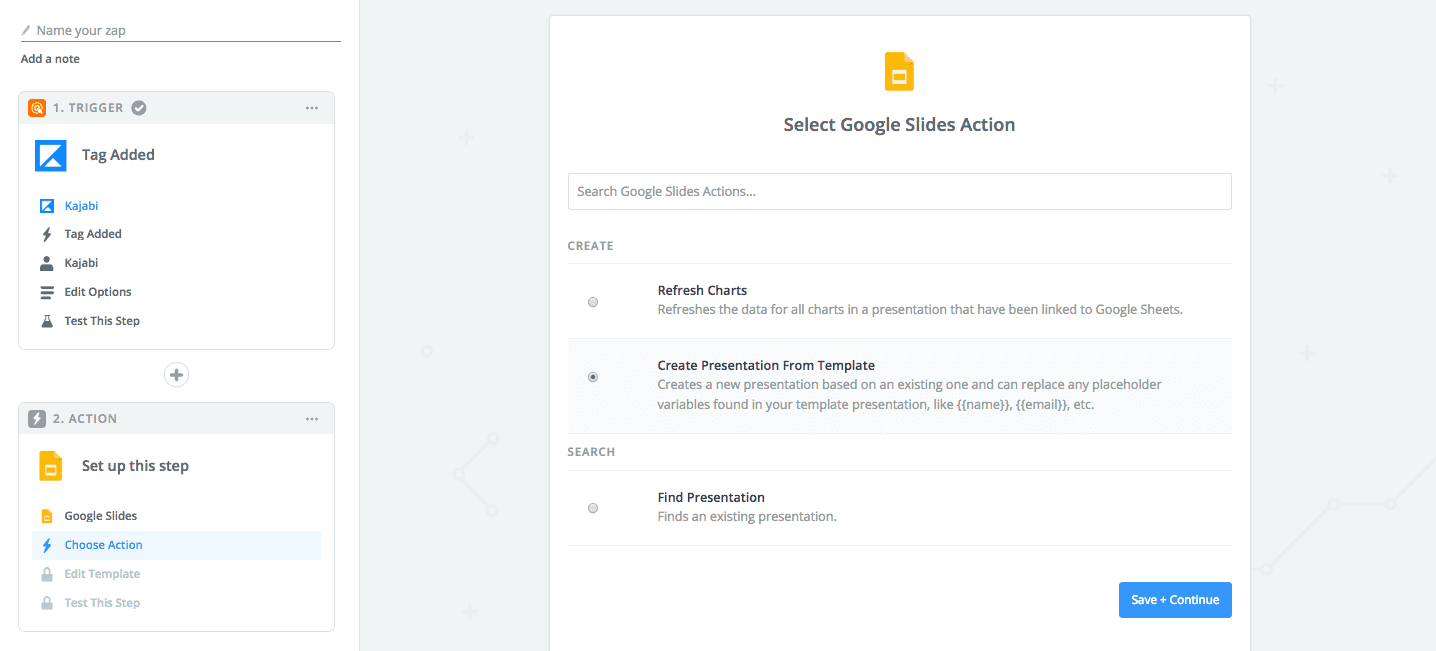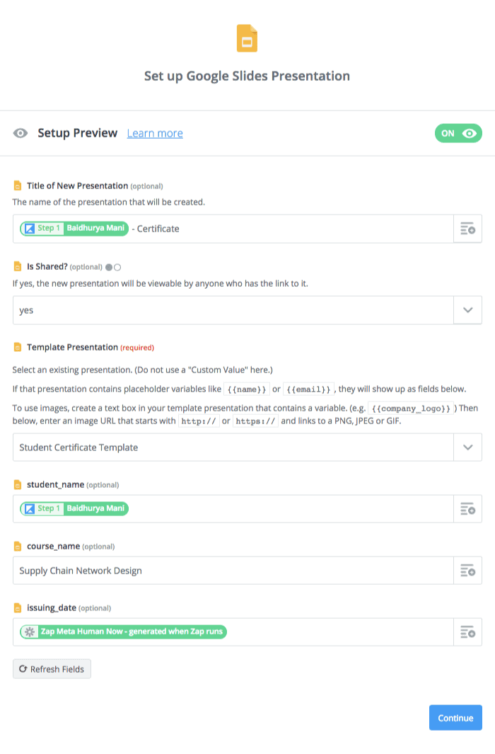 You can now select the “Create & Continue” button to preview how the final certificate will appear. This will instruct Zapier to generate a new presentation inside your Google Slides account.