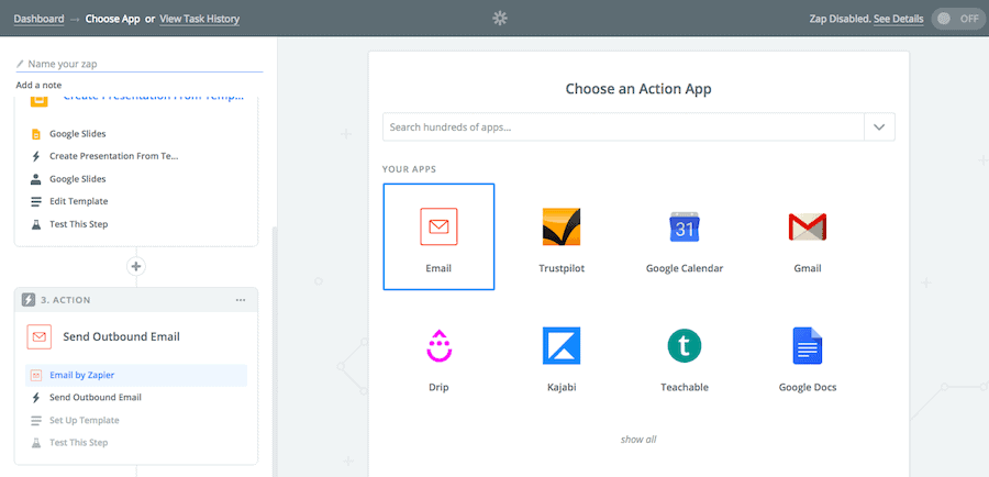 Therefore, proceed by adding another action app at the conclusion of your workflow, selecting Email by Zapier.