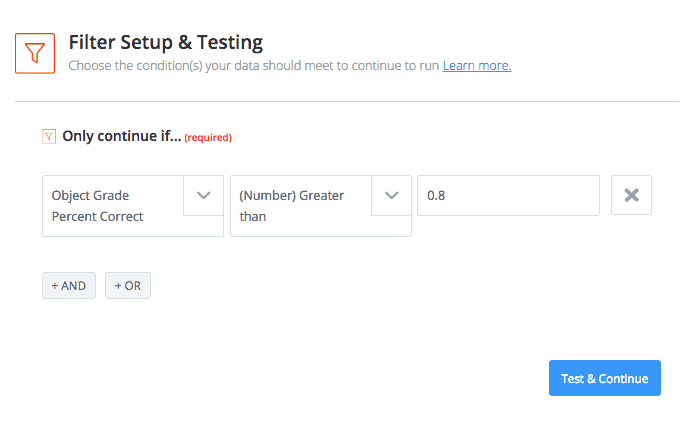 The solution in this situation is to insert a filter step between your trigger and action applications. Here, you can define a condition that the student’s score must be higher than the passing score. This will guarantee that a certificate is generated only when a student has successfully passed the quiz.
