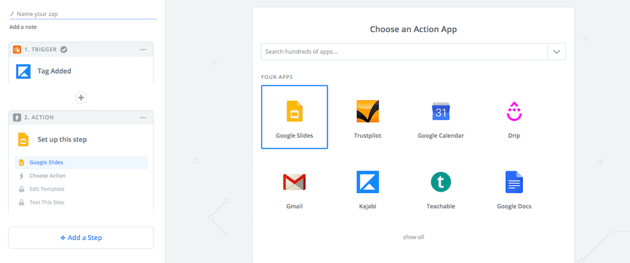 With your trigger application now fully configured, we can proceed to establish the corresponding action step. For this workflow, the action application will be Google Slides, so you will need to search for it and select it as the action app.