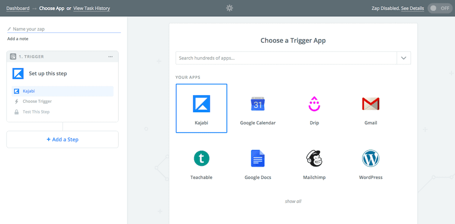 To begin, you will designate your online course system as the trigger application. As an illustration, should you be using Kajabi, you will simply search for it and then choose it from the catalog of available applications on the right.