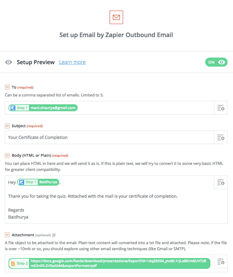 So, the foundational setup for generating a certificate within Google Slides is now complete, and at this point, we can enhance the Zap to ensure the certificate is also delivered to the student automatically.