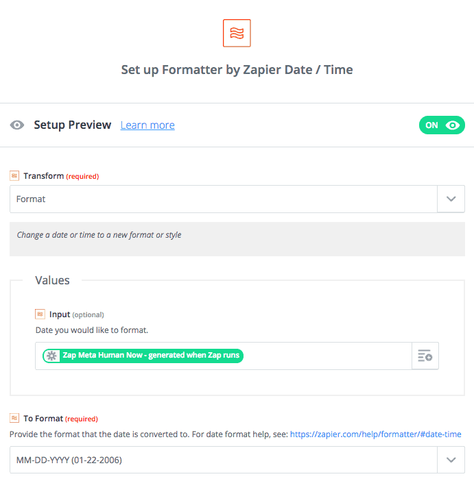 The Formatter step should be positioned in your Zap immediately before the Google Slides step, which allows it to pass the correctly formatted date to your certificate template.