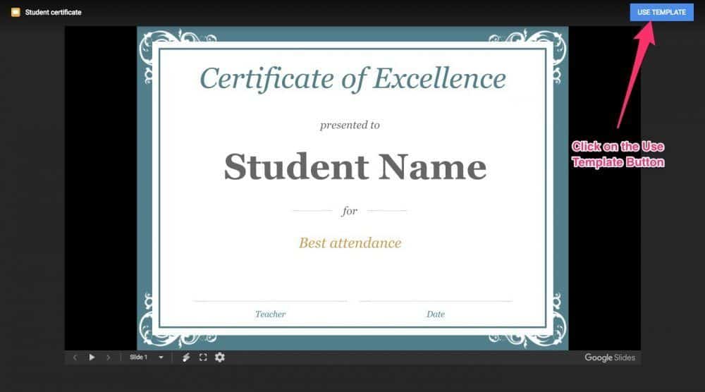The first task in this procedure is to create your certificate master copy in Google Slides. You can design a presentation from the ground up or you can select one of the pre-built templates. For the purpose of this tutorial, we will be working with a standard template that is located here.