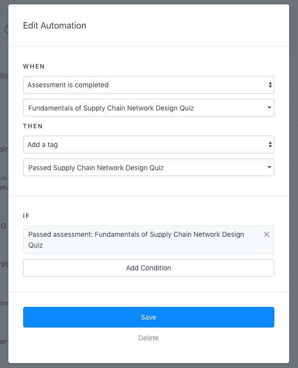 Adopting the strategy of tagging students within Kajabi provides assurance that the user has successfully passed the quiz before this automated workflow is initiated.